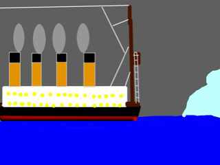 This sea giant sailed smooth until the night of April 14th. At about 11:30 PM in the crow's nest, Fred Fleet, one of 6 lookouts on board, saw an iceberg. A few minutes later the ship turned starboard, too little, too late. The iceberg cut a hole in the side, making many passengers wake up, surprise those that were awake, and allowed water to gush in. The Titanic's end rose up and up as lifeboats were lowered until no more lifeboats were left, but more than 1,500 passengers were left. When crack! The ship snapped in two, but the middle section hadn't fully come off. This still detachment pulled the back straight up. Finally the middle came off, and the ship had vanished at about 02:20 AM. Only 774 were saved. Captain Edward J. Smith, designer Thomas Andrews and over 1,500 were lost. The sunken Royal Mail Steamer was found 74 years later, 2 - miles down.
